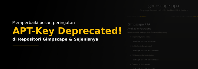 Sekitar Januari atau awal Februari lalu, muncul peringatan bahwa APT-Key masuk ke fase deprecated. Jika kamu adalah pengguna Repositori Gimpcape dan pengguna Distro Debian 11 atau Ubuntu 22.04 kemungkinan besar akan mendapatkan pesan peringatan seperti di bawah ini ketika menjalankan sudo apt update