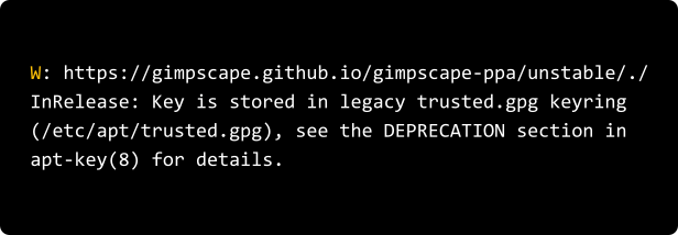 Sekitar Januari atau awal Februari lalu, muncul peringatan bahwa APT-Key masuk ke fase deprecated. Jika kamu adalah pengguna Repositori Gimpcape dan pengguna Distro Debian 11 atau Ubuntu 22.04 kemungkinan besar akan mendapatkan pesan peringatan seperti di bawah ini ketika menjalankan sudo apt update