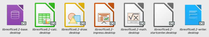 Ikon yang semestinya ditampilkan, sesuai ikon sistem, mestinya serupa Writer dan Base (sudah saya ganti untuk melihat perbedaannya). Namun karena berkas ikon LibreOfice yang mendapat imbuhan nomor versi 6.2 tidak ditemukan di sistem maka LibreOffice akan menggunakan ikon bakunya sebagaimana yang tampak pada LibreOffice selain Writer dan Base. Apakah ikon bakunya tidak bagus? Tidak juga, hanya saja ikon baku dari LibreOffice ini memerlukan sedikit waktu muat agak lama sebenarnya karena memuat banyak efek baik gradien maupun bayangan blur. Dan lagi, tampilan ikon jadi tidak tampak harmoni dengan ikon lainnya.